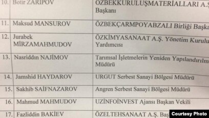Бу суҳбатдошга кўра¸ делегация таркибидаги ҳар бир вазирлик¸ қўмита ва холдинг раҳбари (делегация рўйхати илова қилинмоқда – таҳр.) шахсан президент Мирзиëевдан туркларни ўз соҳасида қиммати камида 100 миллион долларлик лойиҳага жалб этиш топшириғи билан келган ва бу топшириқни амалга ошириш учун Туркиядаги етакчи ширкатларни қўшма корхона¸ хорижий ширкат ëки ҳиссадорлик шаклидан қай бири маъқул бўлса¸ шу шаклда Ўзбекистонга кириб¸ иш бирлиги қилишга астойдил таклиф қилмоқда.