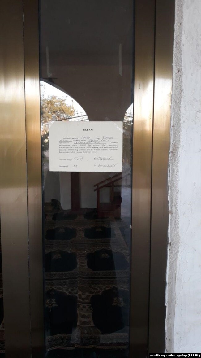 Масжидга борган намозхонлар томонидан суратга олиниб, “Озодлик” радиосига йўлланган ушбу эълон тилхат кўринишида бўлиб, унга масжид имоми Бурҳон Пардаев билан мутавваллиси Ўрол Боймирзаев имзо чеккан.
