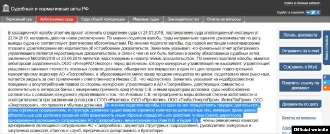 Россия Федерацияси Шимолий Кавказ Округ судининг 2019 йил 23 июль куни чиқарган қарорида аризачи – Энекс компанияси собиқ ижрочи директорининг суд ҳайъатига топширган шикояти мазмуни ҳам келтирилган.