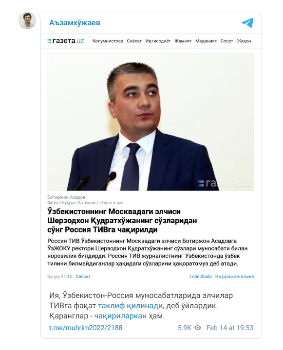 Россия Ташқи ишлар вазирлиги Ўзбекистоннинг Москвадаги элчиси Ботиржон Асадовга Ўзбекистон Журналистика ва оммавий коммуникацияар университети ректори Шерзодхон Қудратхўжанинг сўзлари муносабати билан норозилик билдирди.