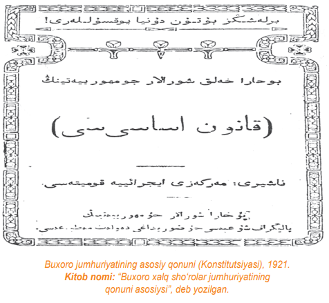 Buxoro xalq sho‘rolar jumhuriyatining 1921- va 1922-yildagi Asosiy qonuni (Konstitut siyasi) 3-moddasida shunday band mavjud: