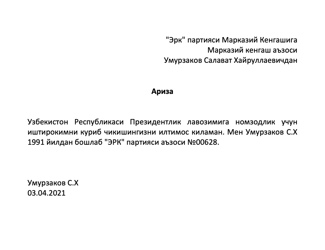 Бугунга қадар Партия Марказий Кенгашига президентлик сайлови учун номзоди тасдиқланишини сўраб икки нафар партия аъзоси мурожаат этди.